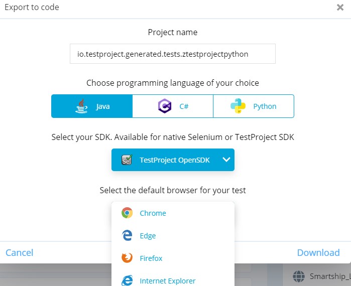 Every step that you carried out will be recorded as a test and automatically (Selenium/Appium) code will be generated in the background that can be downloaded (Python, Java, and C#) and executed in a local folder with changes if any.