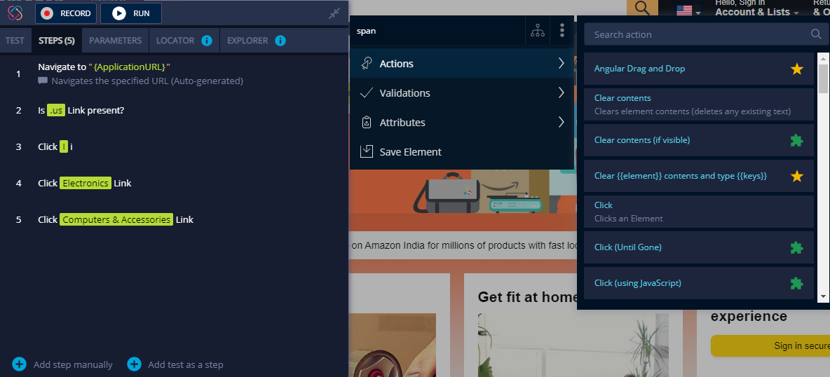 By using this feature, one can test any element in your application. You can select from different built-in or suggested actions, validations, attributes, save elements and much more.