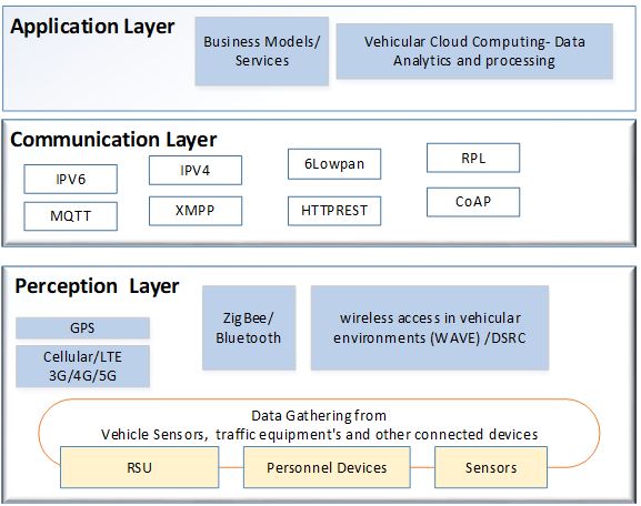 Perception Layer: It gathers the information from sensors which is connected to vehicles. It also collects data from Road Side Units (RSU) and other personnel devices. The perception layer is mainly used for collecting the details and different protocols are implemented depending upon the interfaces.