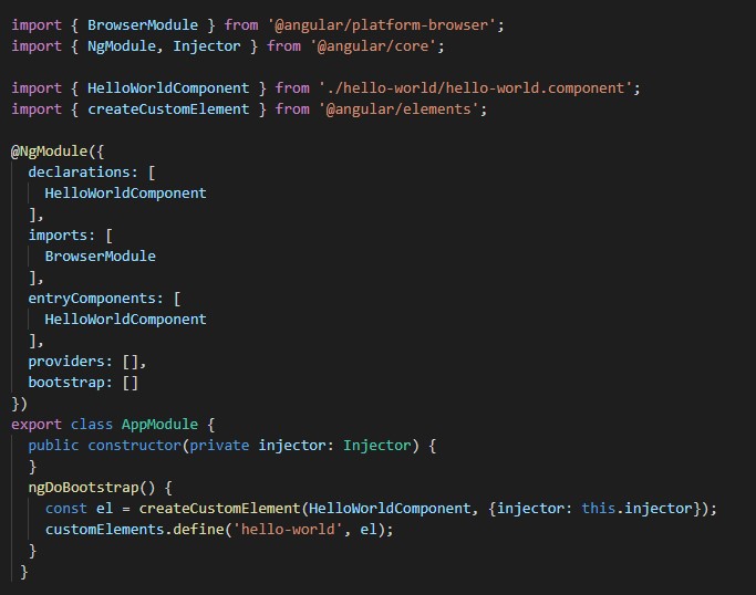 Remove AppComponent from bootstrap array and add one method named ngDoBootstrap() in AppModule class which used to bootstrap manually. Then create a customElement and register it. The updated app.module.ts file will look like below.