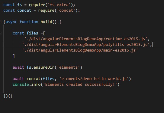 It will generate 3 different JS files – main-es2015.js,polyfills-es2015.js, and runtime-es2015.js file. So,we need to concat these three files into one single file, we will add the following packages to our application.