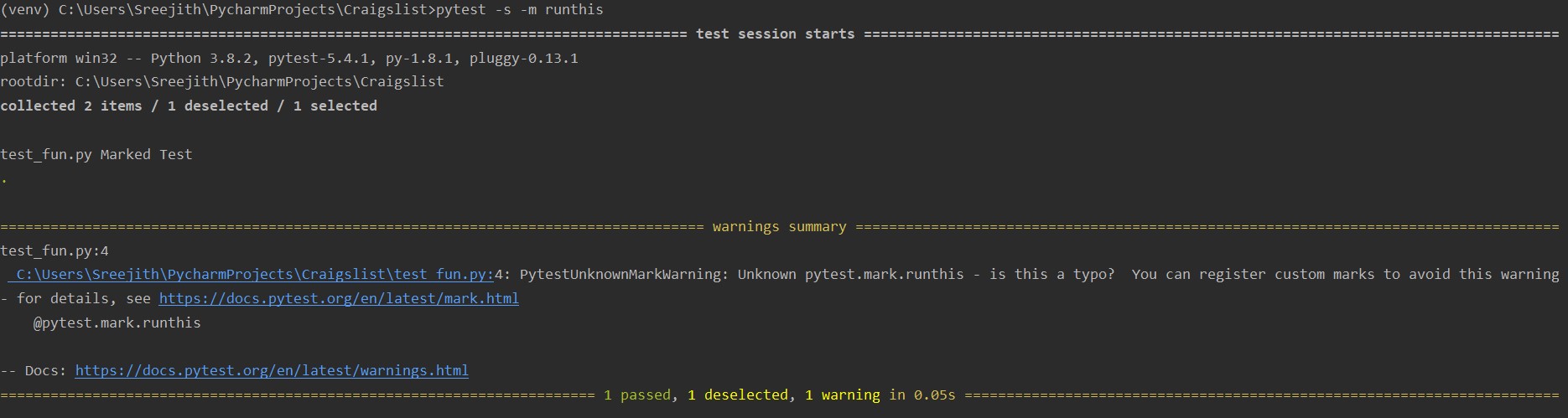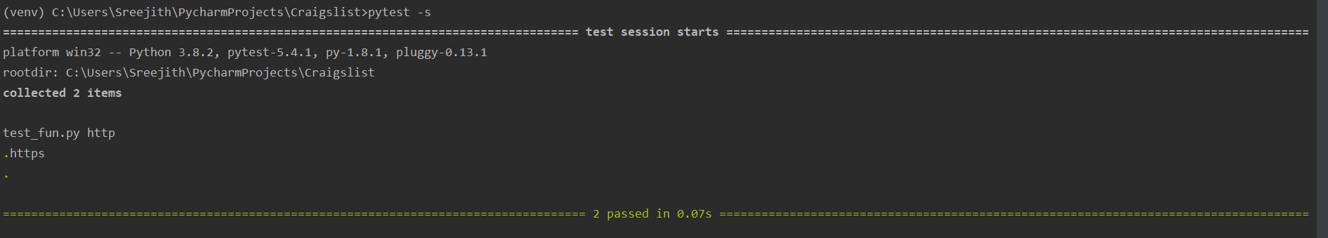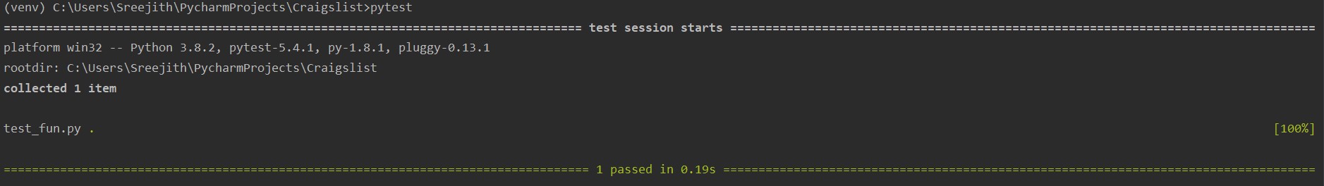 In order to use pytest, we need python in our PC and then ‘pip install pytest’. In the below example we can see that, we ran only specifying command pytest, not even the file name.