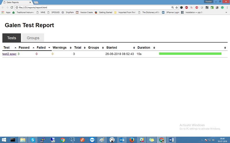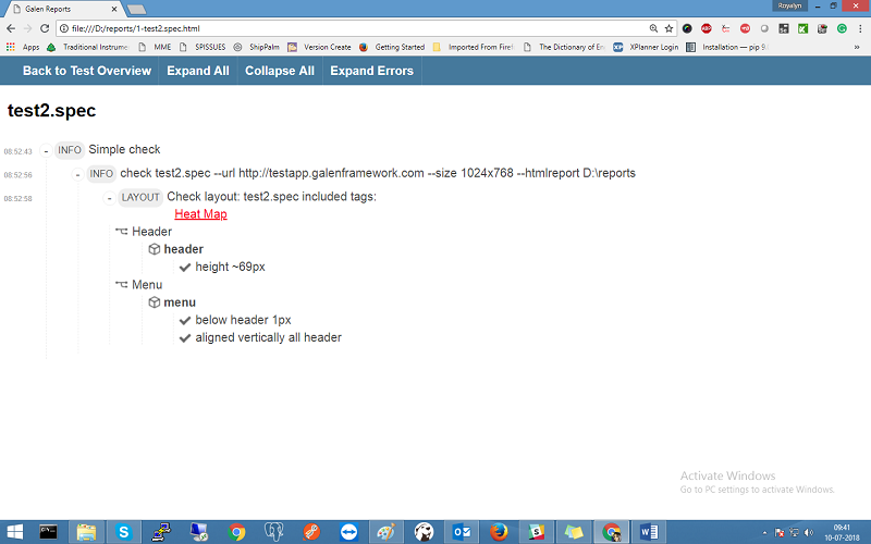 D:\Demo_Galen>galen check filename.spec –url http://testapp.galenframework.com –size 1024×768 –htmlreport D:\reports