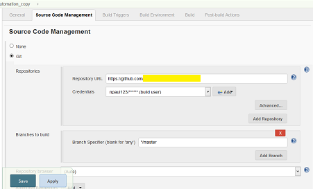 If we are using Git for Source Code Management, we can enter the URL of Git Repository. If the repository is not public, we can add credentials to access it.