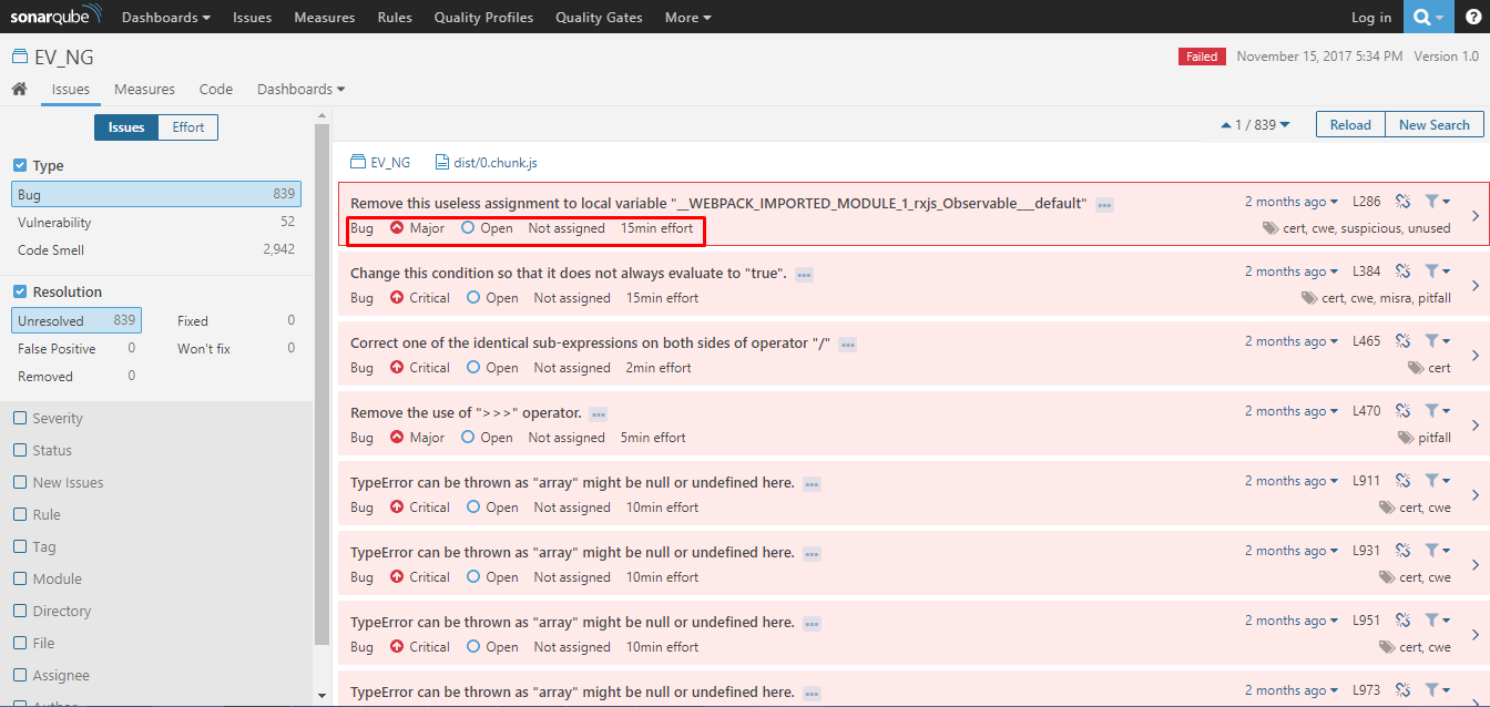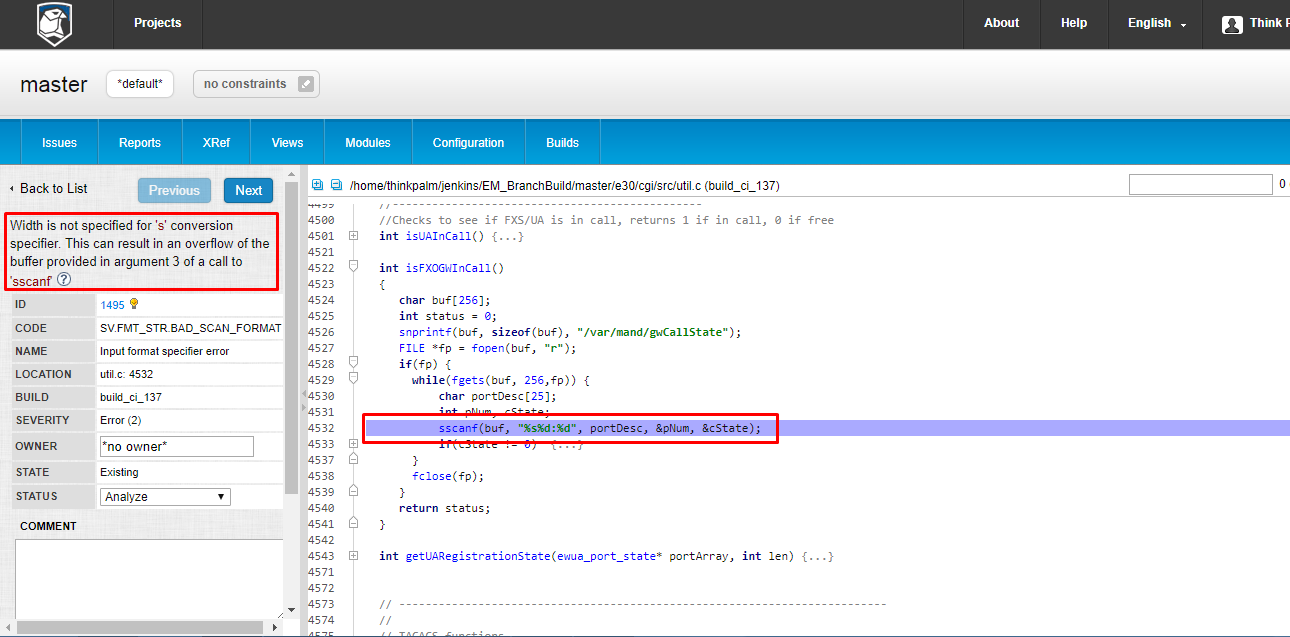 By entering various search conditions in the ‘search’ text box, we can filter the result. Issues are presented with severity, state, status and taxonomy fields. By clicking on the issue, we can find the line of issue.