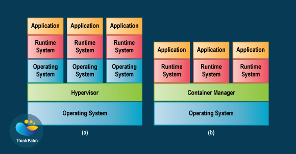 Virtual Machines (VMs) and Containers differ only on few dimensions; while VMs provide a virtualized environment to run multiple OS instances (see figure a), containers provide a method to isolate applications and act as a virtual platform for more applications (see figure b). Containers offer a way to virtualize an OS enabling multiple workloads to run on a single OS instance while in VMs, the hardware is virtualized to run multiple OS instances. Containers’ agility, portability and their speed make them yet another tool used for streamlining software development.