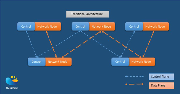 In traditional WAN, the physical network is tightly coupled with Data and Control planes, resulting in the Operations/Business team having no control over WAN.